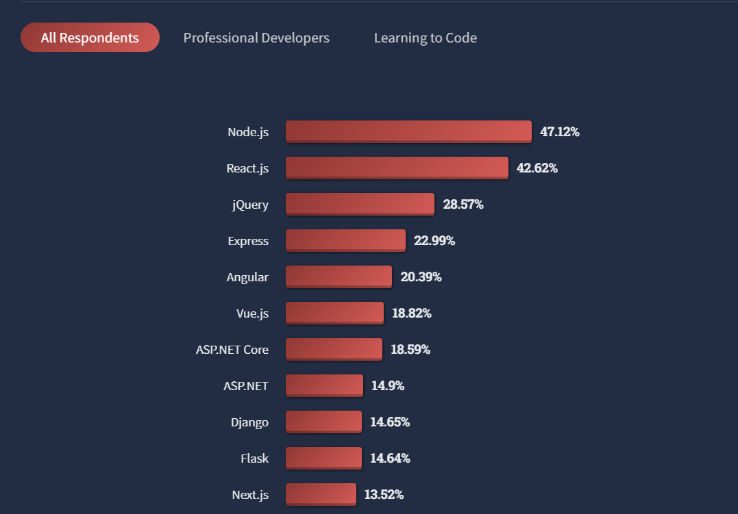 Node.js, React.js, Express, Angular 등 1위부터 10위로 선정된 프레임워크 및 기술 들 중 자바스크립트 기반의 프레임워크와 기술들이 절반 이상을 차지하고 있는 것을 볼 수 있습니다.
