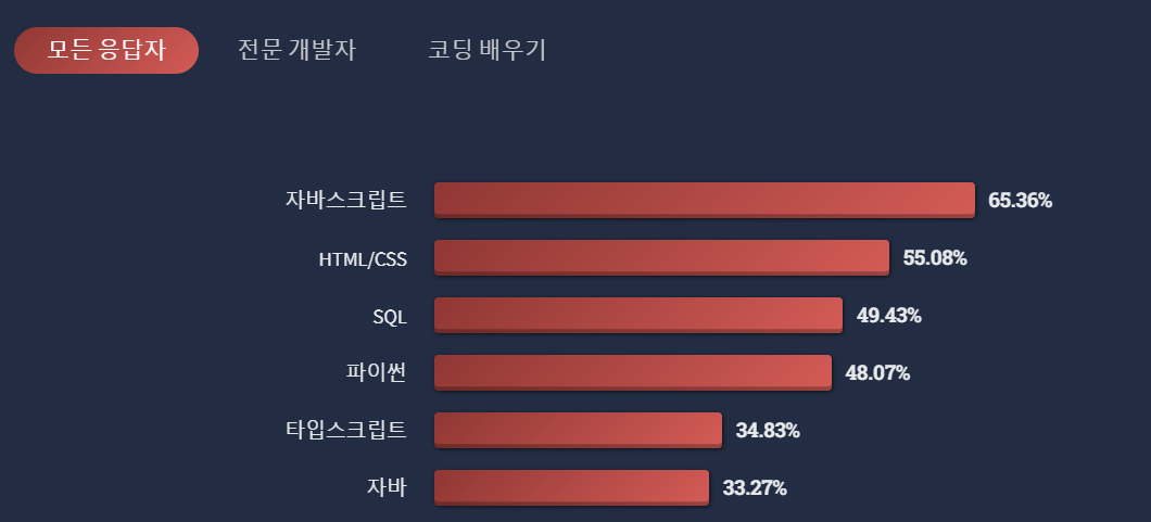 위의 Stackoverflow 2022 설문 결과를 보면 자바스크립트가 2022년 가장 많이 사용되는 기술로 선정된 것을 볼 수 있습니다.